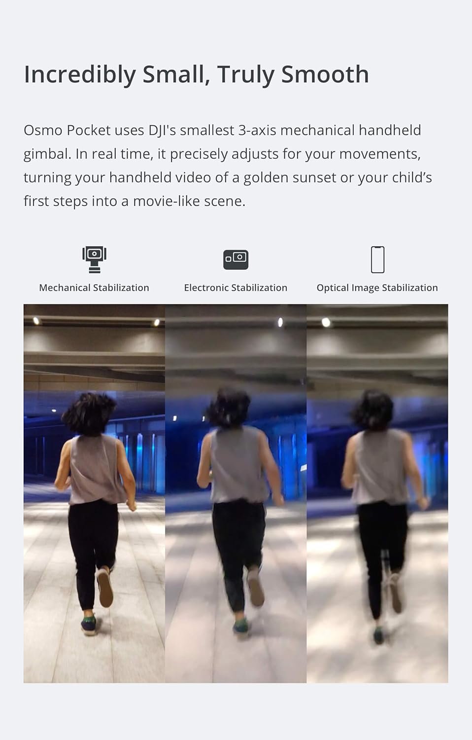 Unlike digital stabilization found in smartphones, the Osmo Pocket features a real 3-axis motorized gimbal, eliminating shake and delivering ultra-smooth cinematic footage — even while walking or moving.
